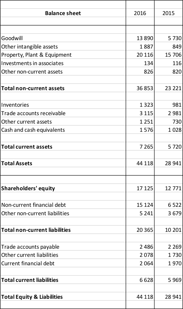 Here is the balance sheet for Air Liquide in 2015 and 2016. You have to build the financial balance sheet and interpret it.